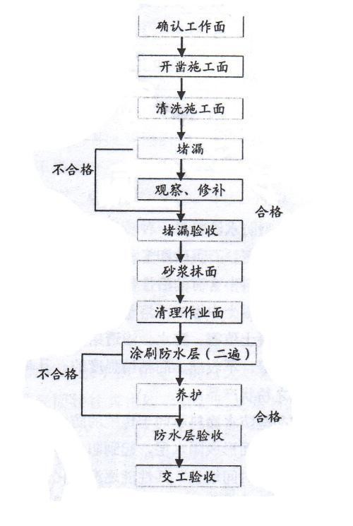 檢查墻地面是否有空鼓,開裂,脫落等問題,如果有進行維修填補。然后打掃干凈墻地面,調制好防水灰漿(按施工面積大小調制,調多浪費,調少),在墻地面進行涂刷,縱橫密集交錯涂刷,地漏,下水管口處做疊加層,施工完畢12-24小時后做閉水試驗,試驗24小時后檢查是否有滲漏,有滲漏進行補漏涂刷,無滲漏結束施工。